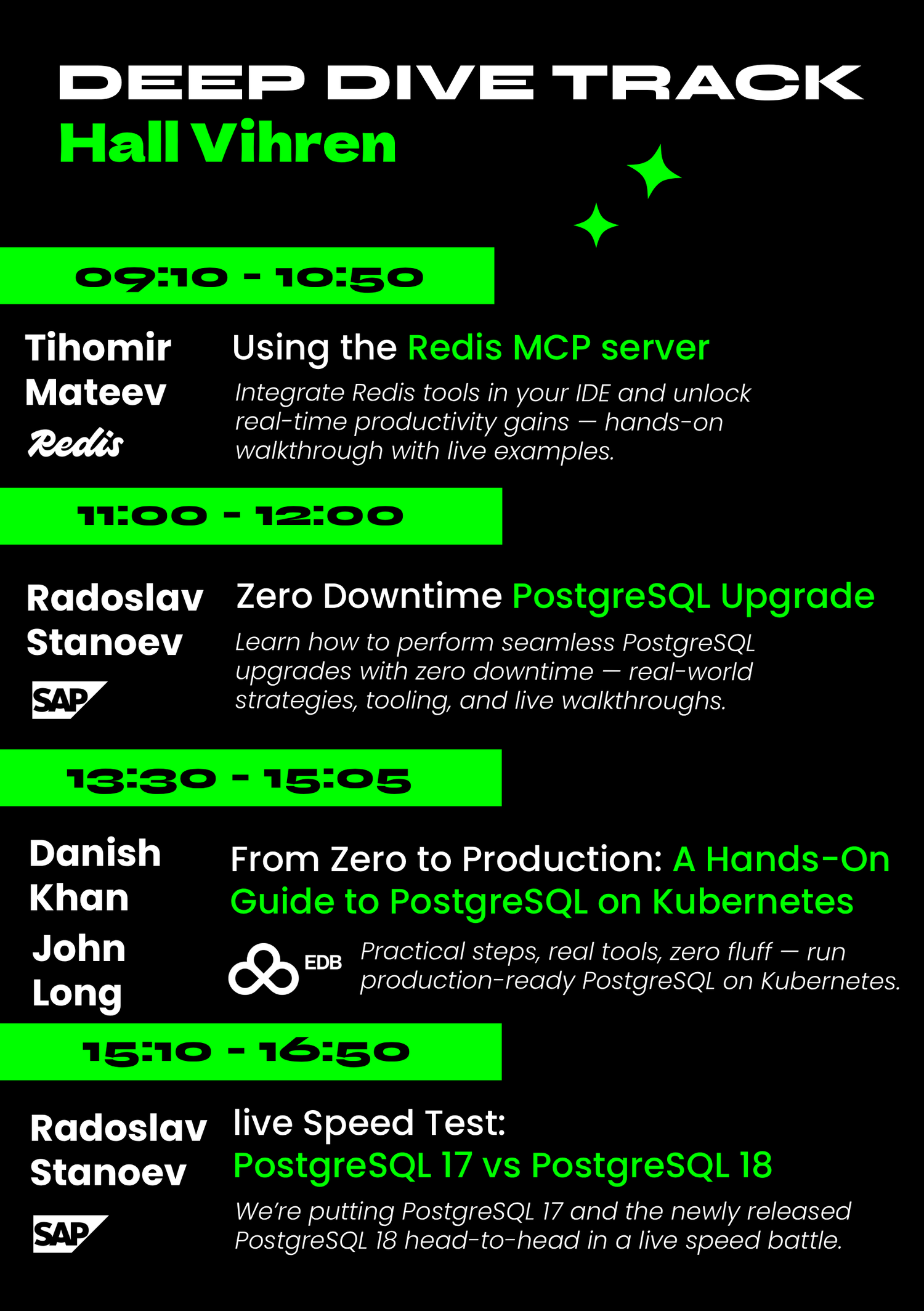 We bring together developers, engineers, SREs, and DevOps professionals for a full day of deep technical talks, hands-on sessions, and real-world stories.From databases and observability to scalability and system design — if you're building, tuning, or deploying data systems, this is your conference.
